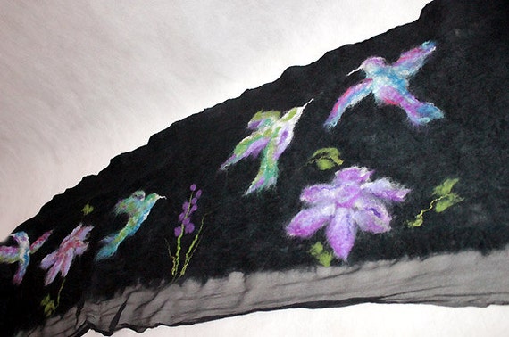 Nuno Felted Scarf Felt Shawl Flowers Hummingbird